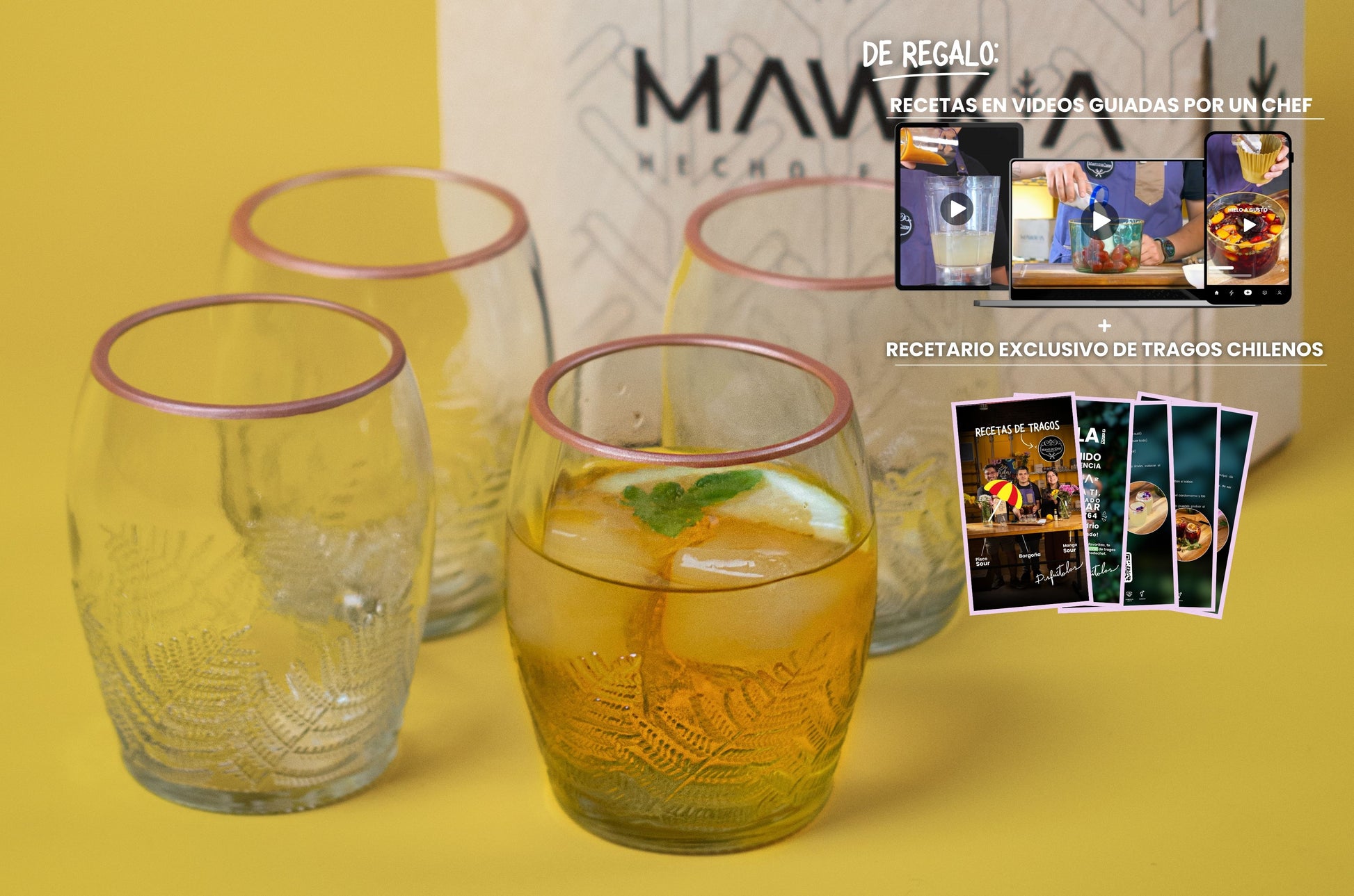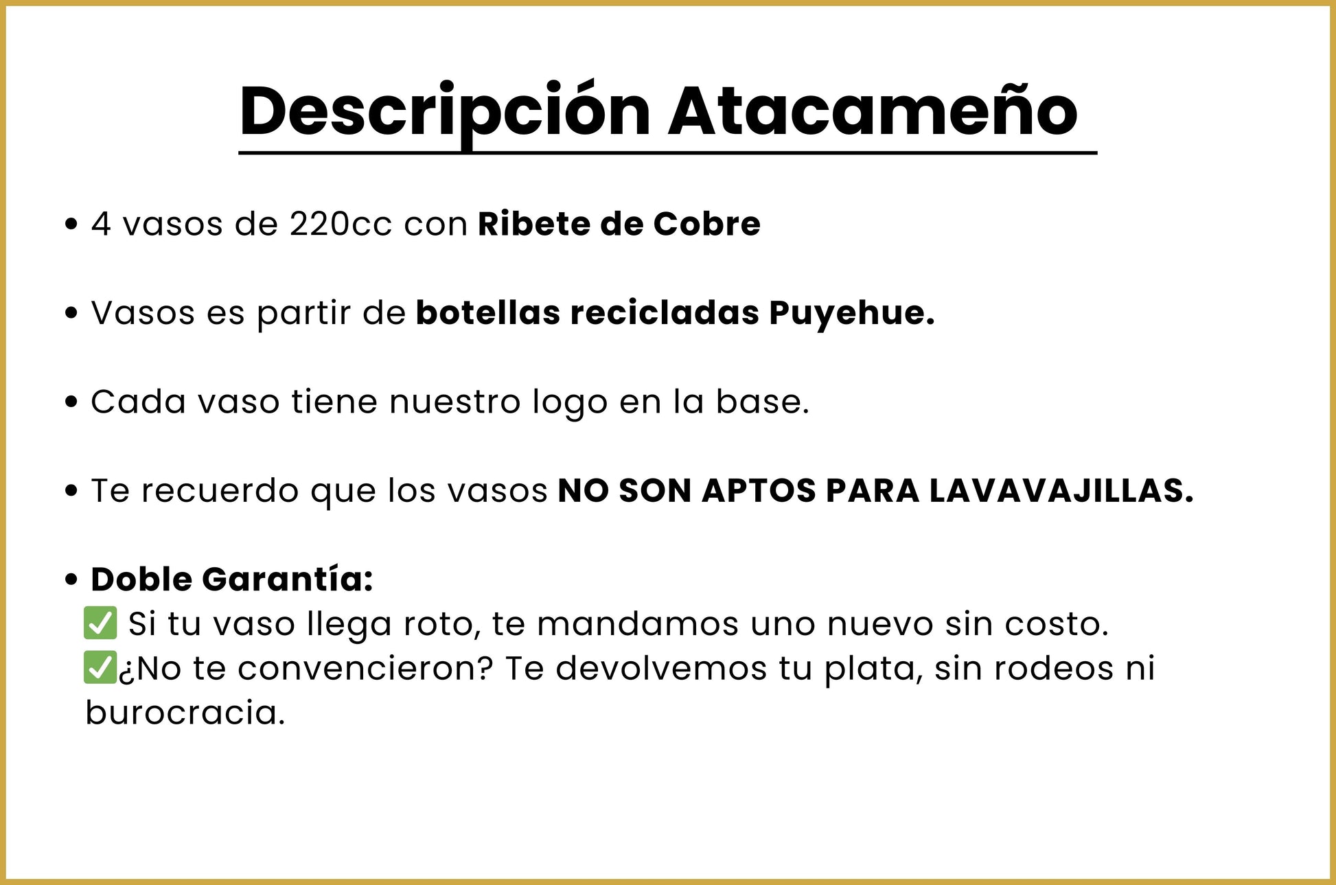 Dentro de la caja encontrarás 4 vasos de 220cc con borde ancho de cobre, cada uno a partir de botellas recicladas puyehue transparente (ganadora del premio al mejor diseño 2019)
